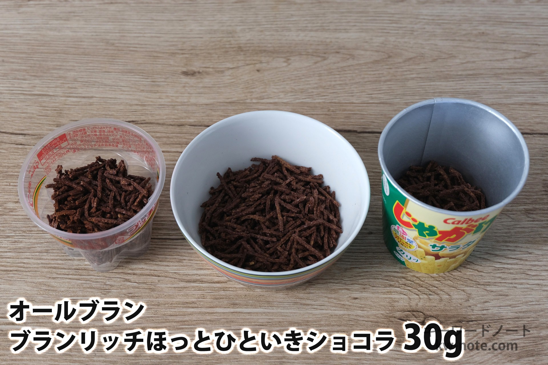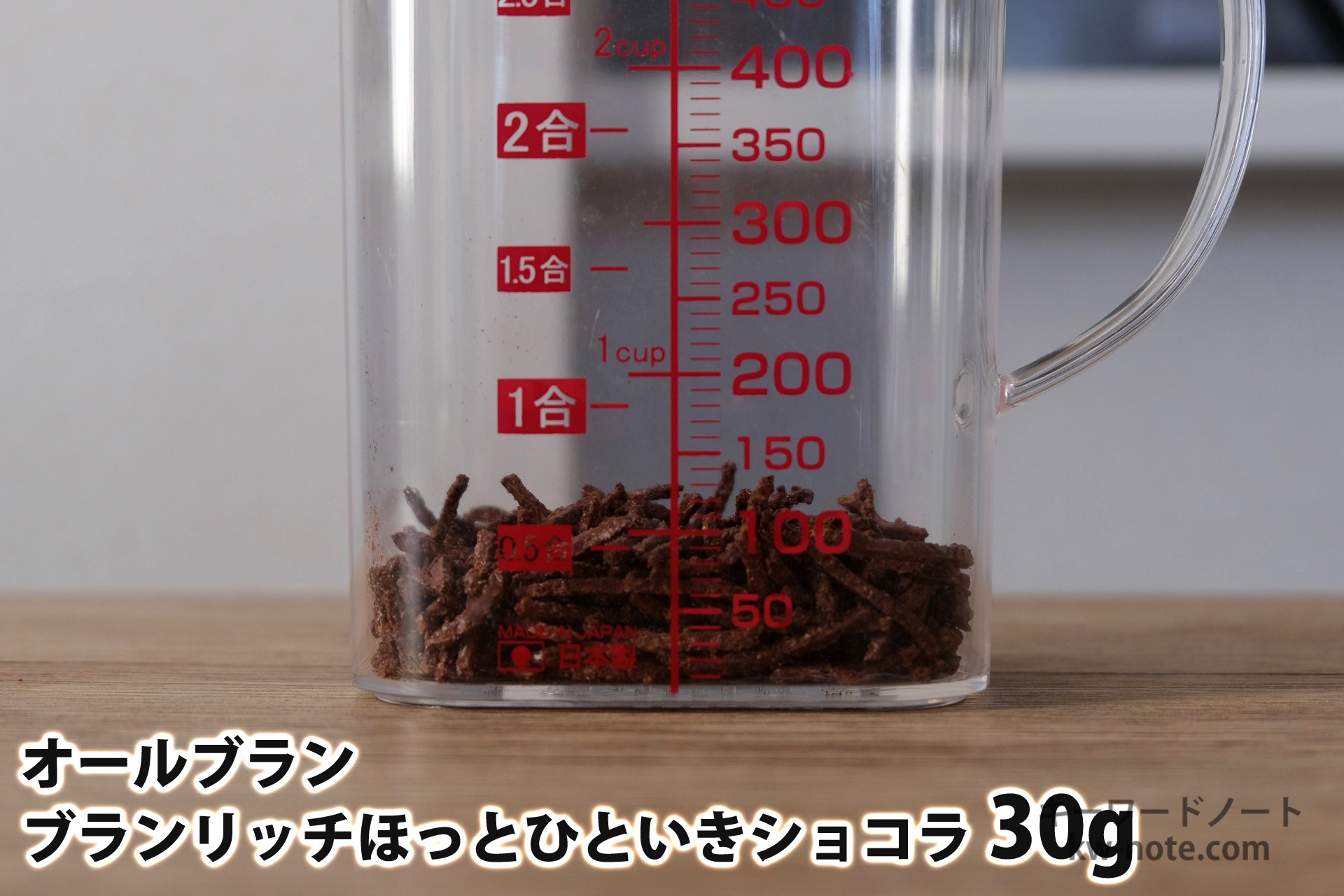 ケロッグから販売されている「オールブラン ブランリッチ ほっとひといきショコラ」1食分の量はどれ位なのかと、各グラムごとの分量の目安、牛乳・ヨーグルト・豆乳をかけた時の栄養成分とともにまとめました。