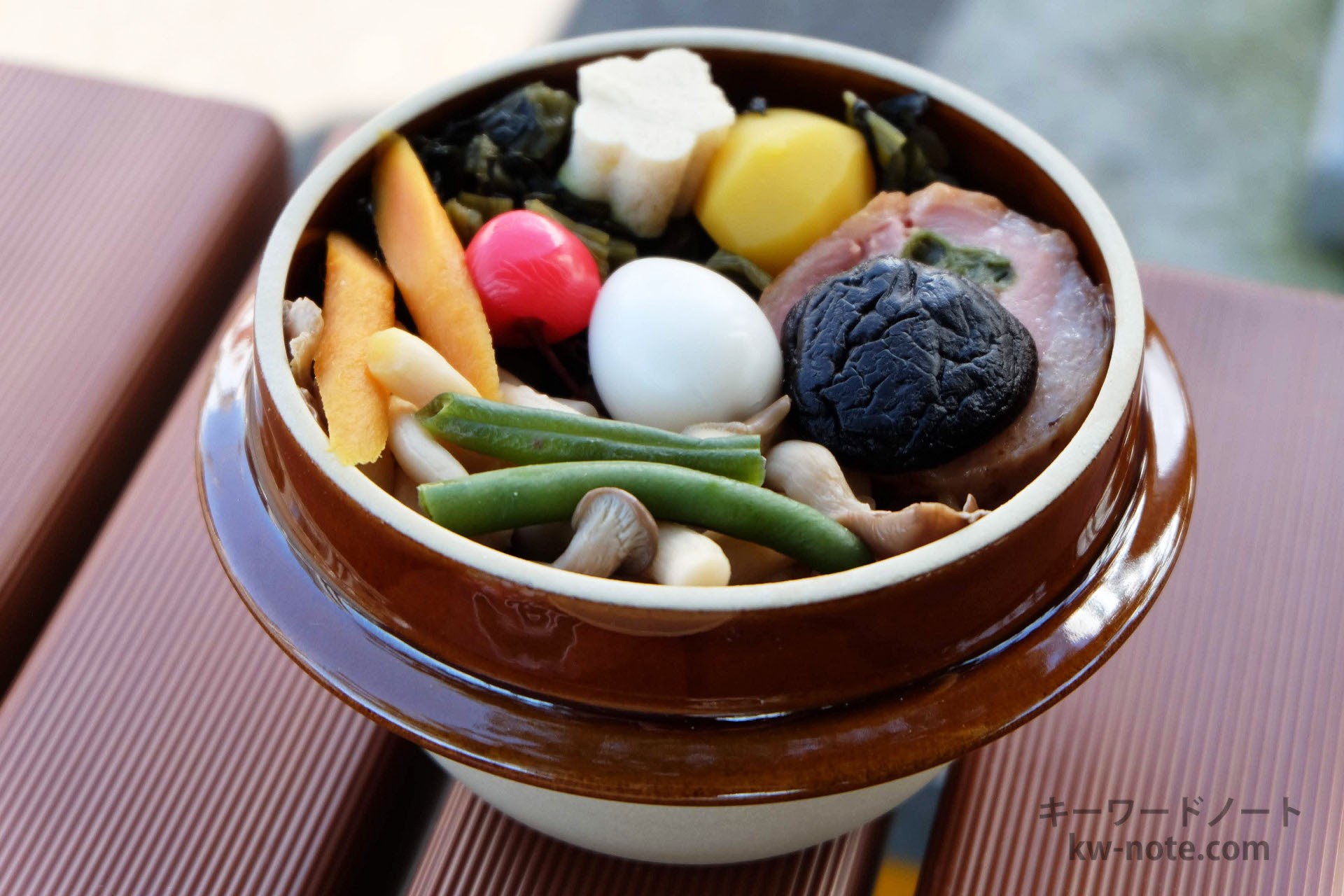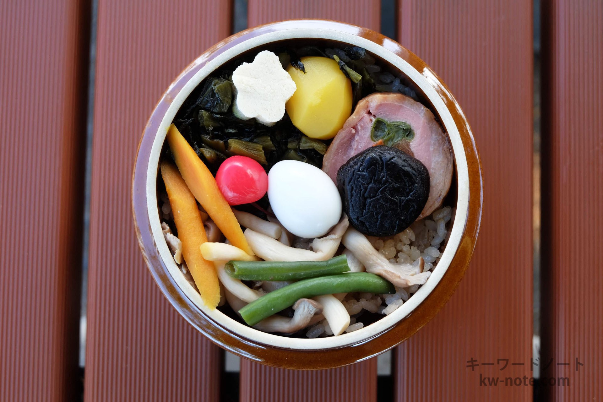 | 原材料名 | 御飯(国産米使用)、合鴨肉、野沢菜、しめじ、うずら卵、栗、さくらんぼ、高野豆腐、しいたけ、いんげん、山ごぼう(もりあざみ)、ごぼう、にんじん、しょうゆ、砂糖、食塩、コーンスターチ、大豆油、唐辛子、調味料(アミノ酸)、酸化防止剤(V.C)、着色料(黄4、青5、赤102、赤104、青1、クチナシ、ベニコウジ)、発色剤(亜硝酸Na)、ミョウバン、ソルビン酸K、乳酸Ca、カゼインNa、原材料の一部に小麦、乳、卵を含む |