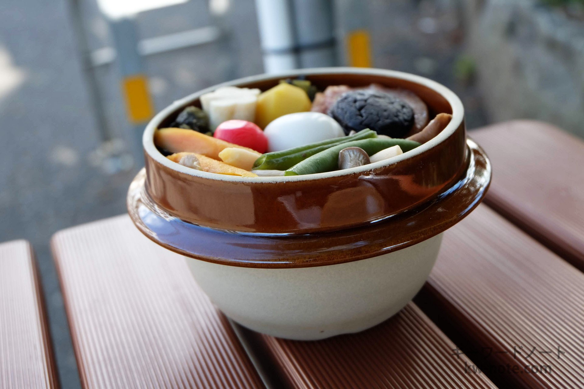 陶器製の土釜(フタはプラスチック製)に山菜・合鴨肉・さくらんぼなどの具材に、素材の味を邪魔しない薄く味のついたご飯が特徴。