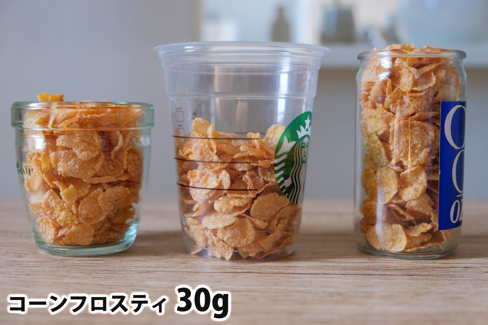 コーンフロスティ30gを「モロゾフ」「トールサイズのカップ」「ワンカップ大関」に入れた時の目安