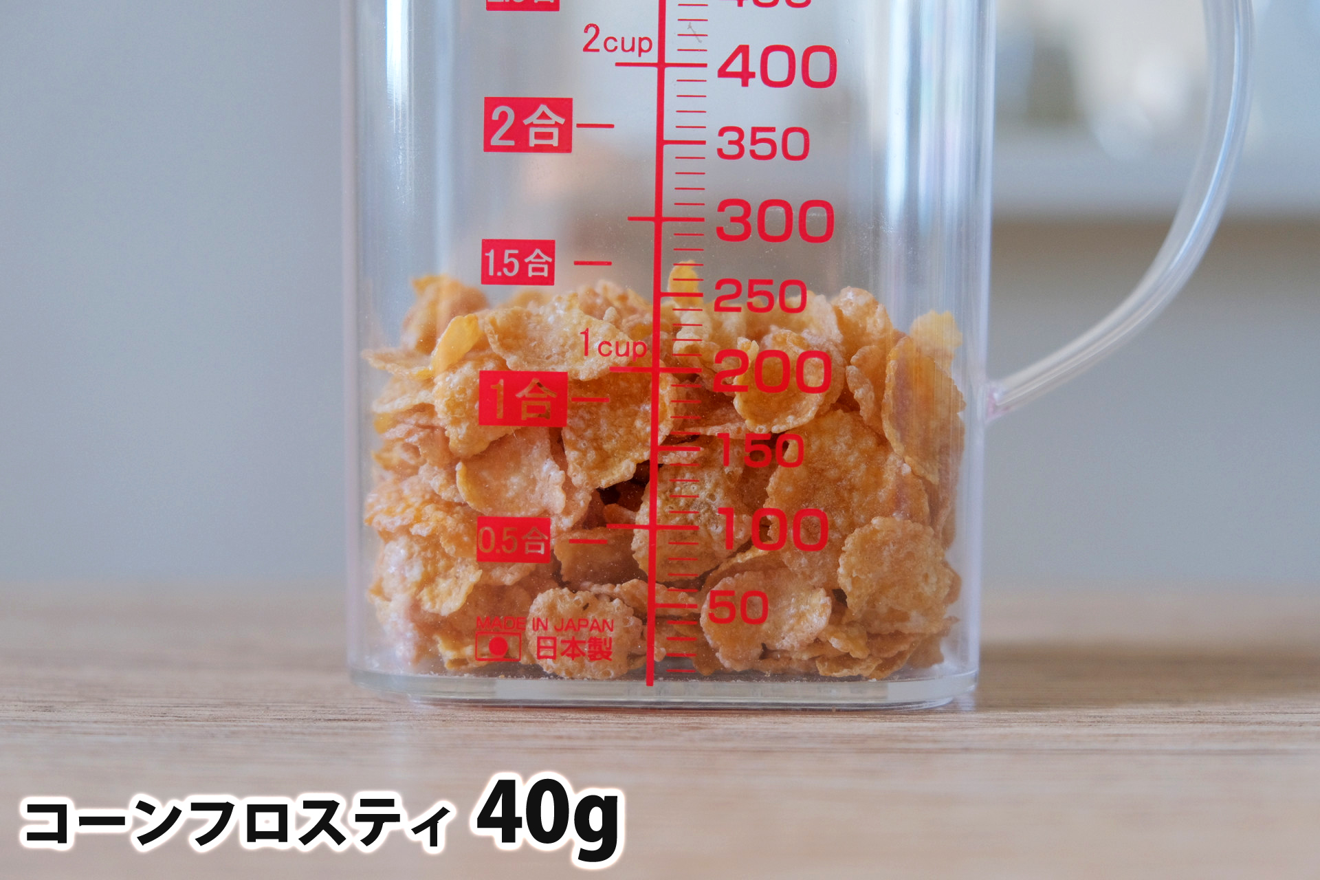 以下ではどれくらいの量なのかを視覚的にイメージしやすいよう、各グラムごとにコーンフロスティをよく目にする容器に入れてみました。
