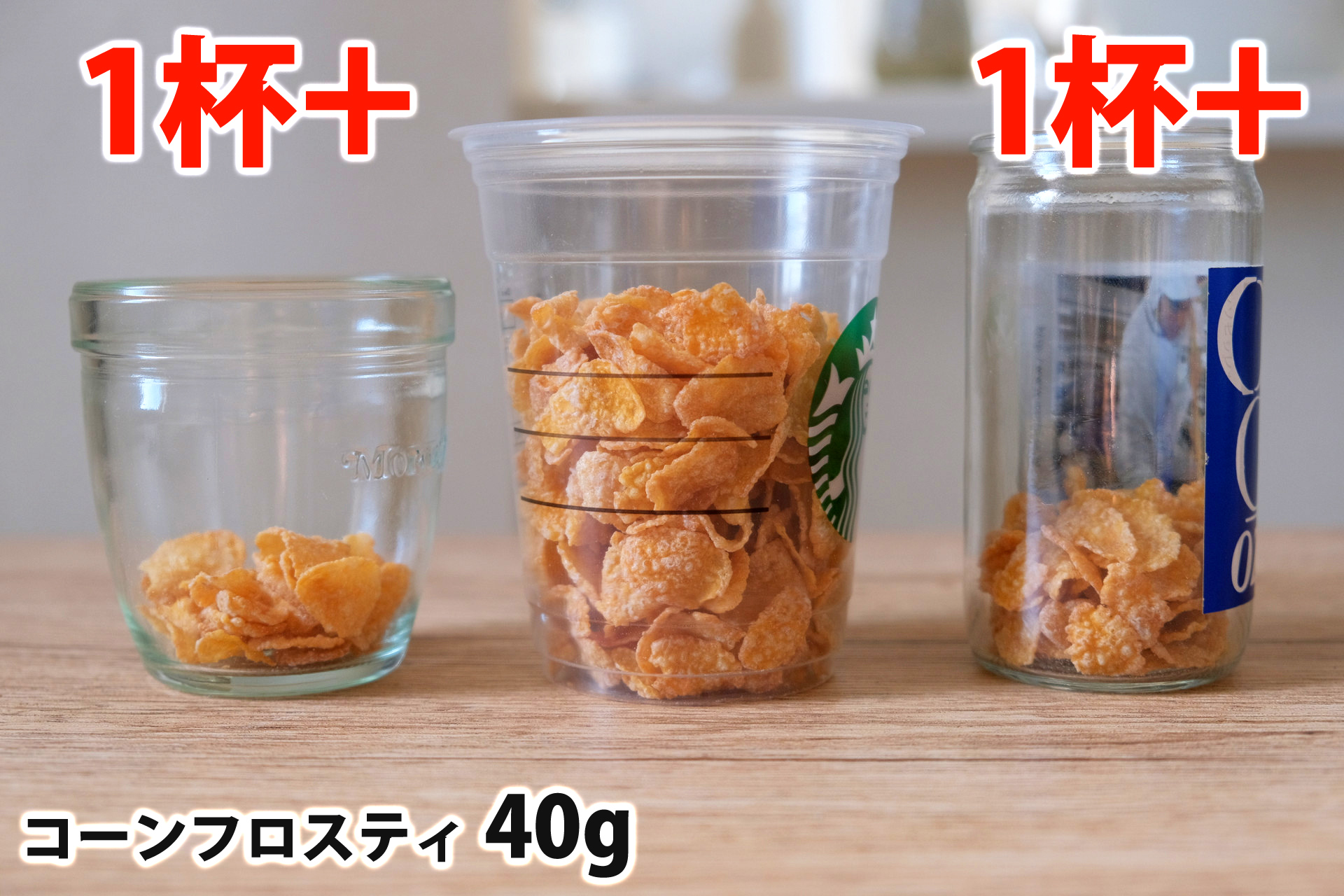コーンフロスティ40gを「モロゾフ」「トールサイズのカップ」「ワンカップ大関」に入れた時の目安