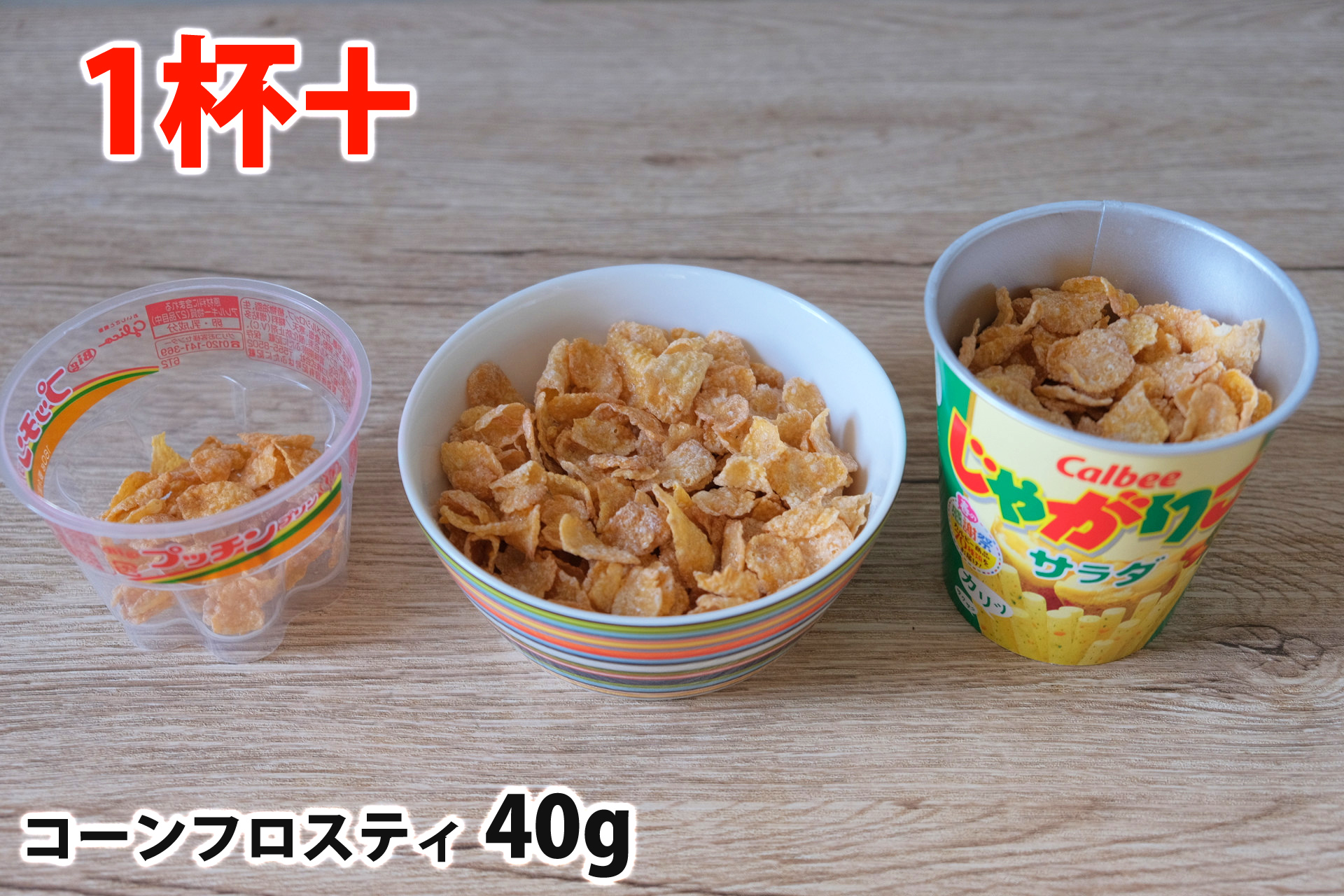 コーンフロスティ40gを「Bigプッチンプリン」「250mlボウル」「じゃがりこカップ」に入れた時の目安