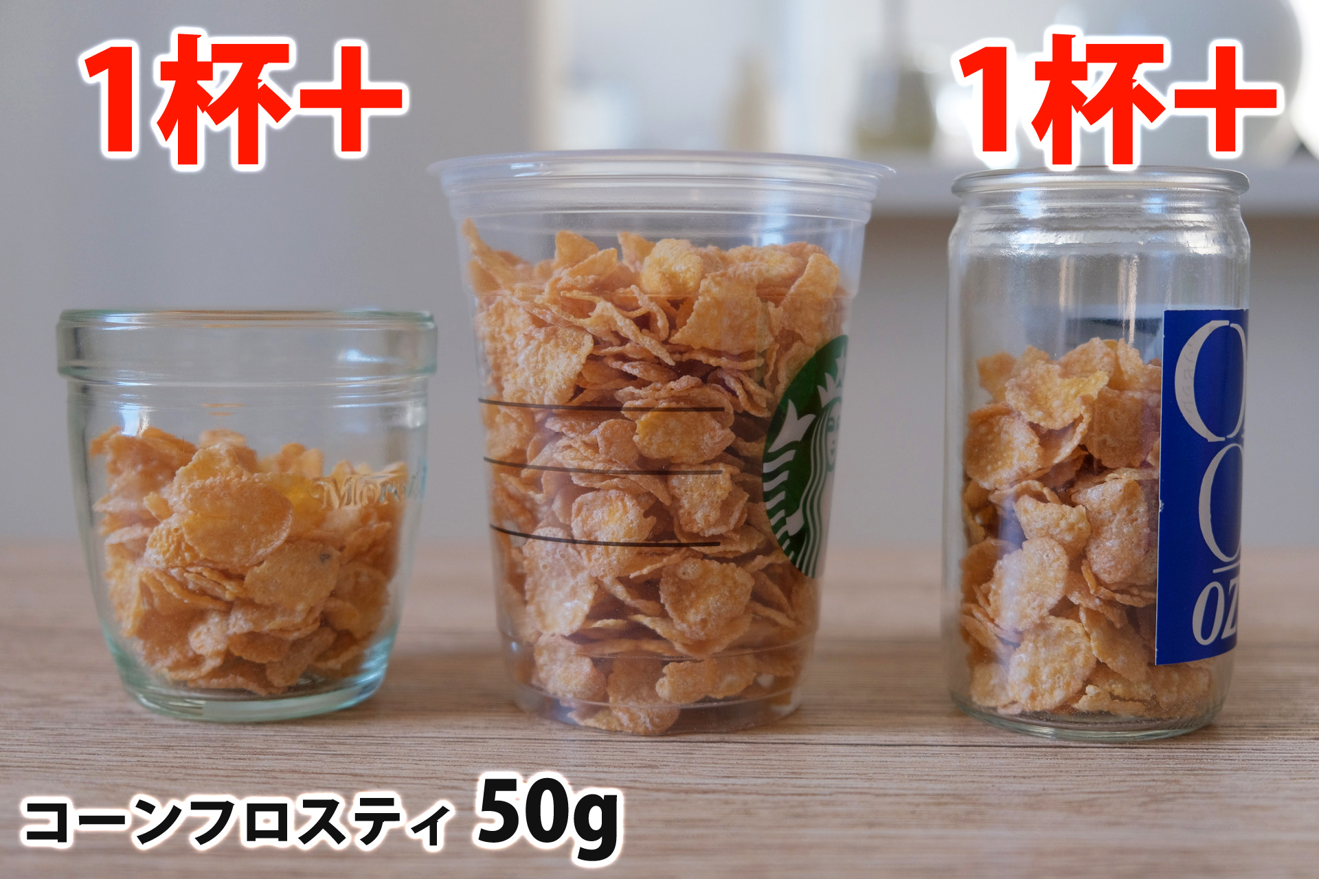 コーンフロスティ50gを「モロゾフ」「トールサイズのカップ」「ワンカップ大関」に入れた時の目安
