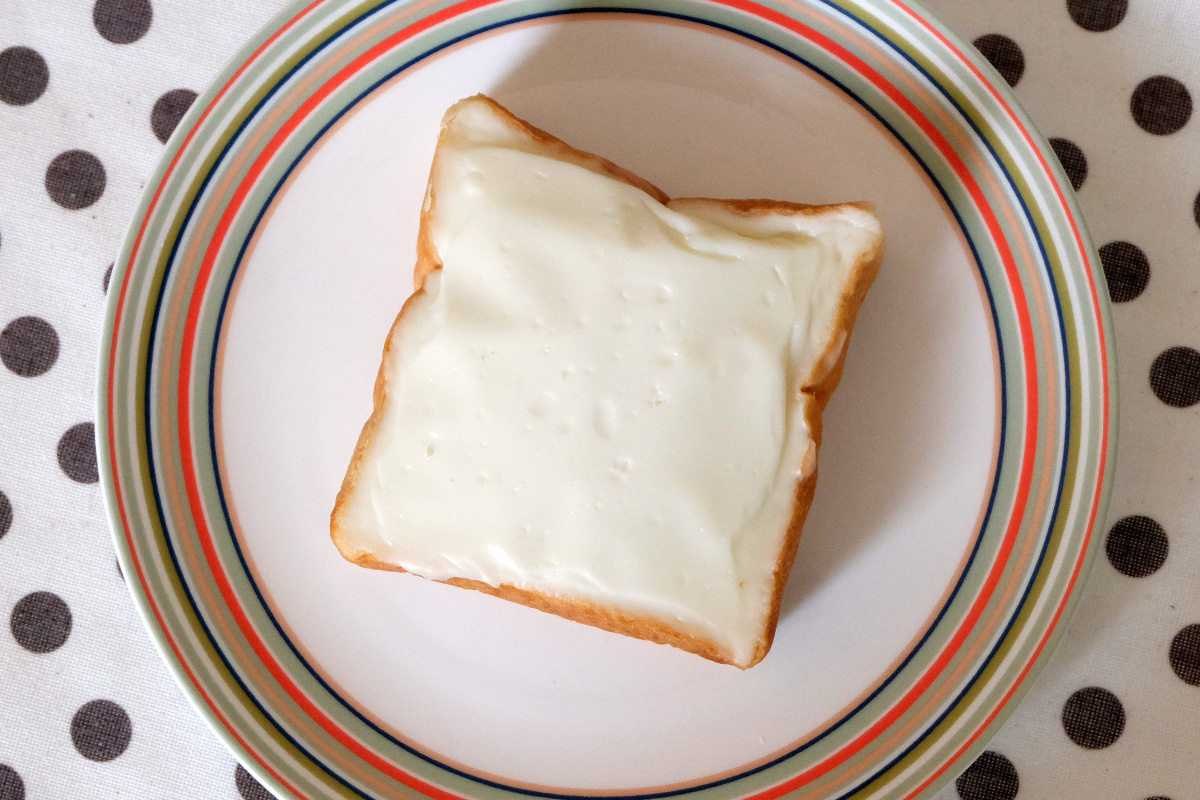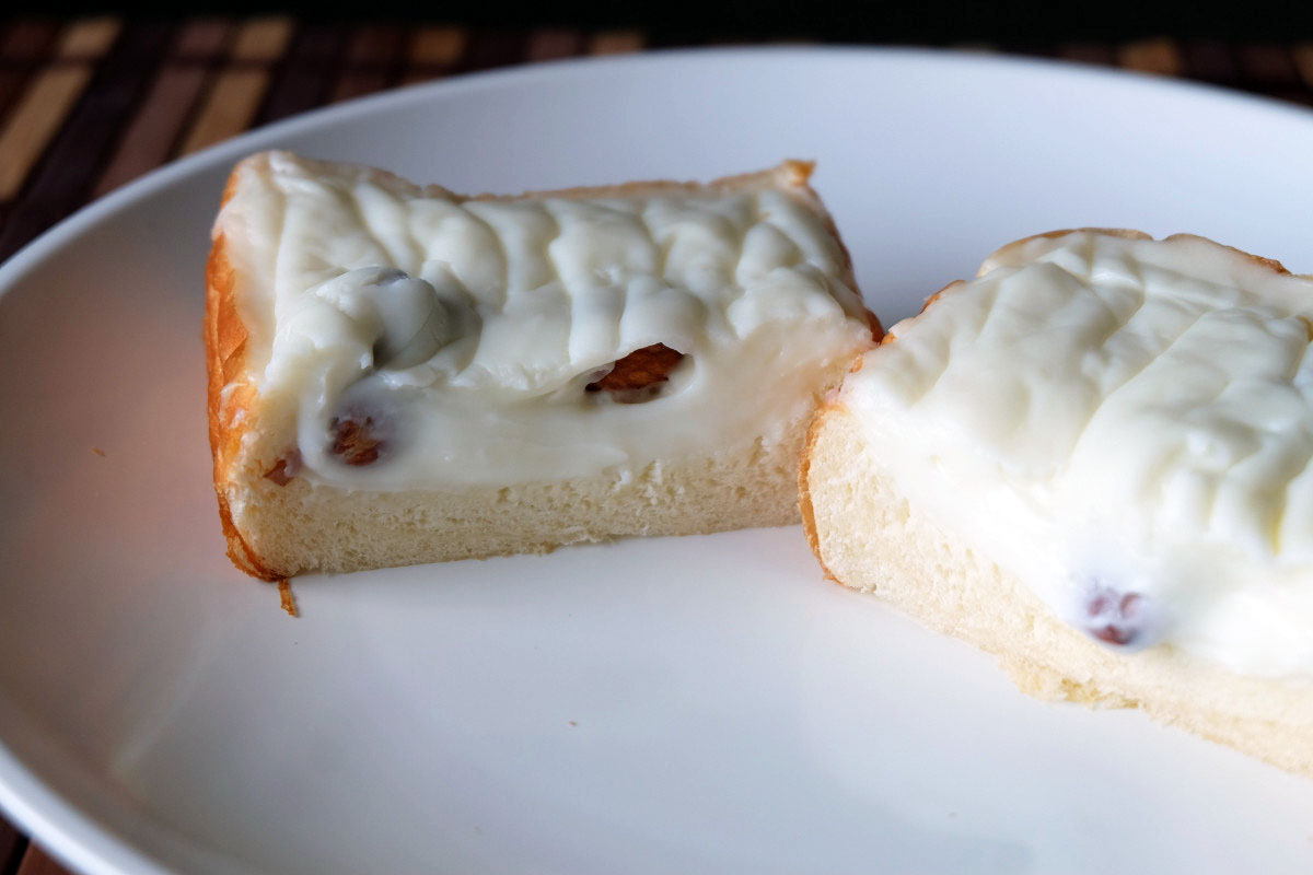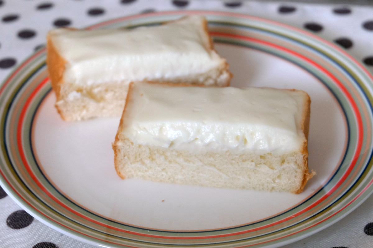 「クリームボックス」は、厚切りにした小さめの食パンの上に、ミルク風味の白いクリームをたっぷりと乗せた菓子パンです。