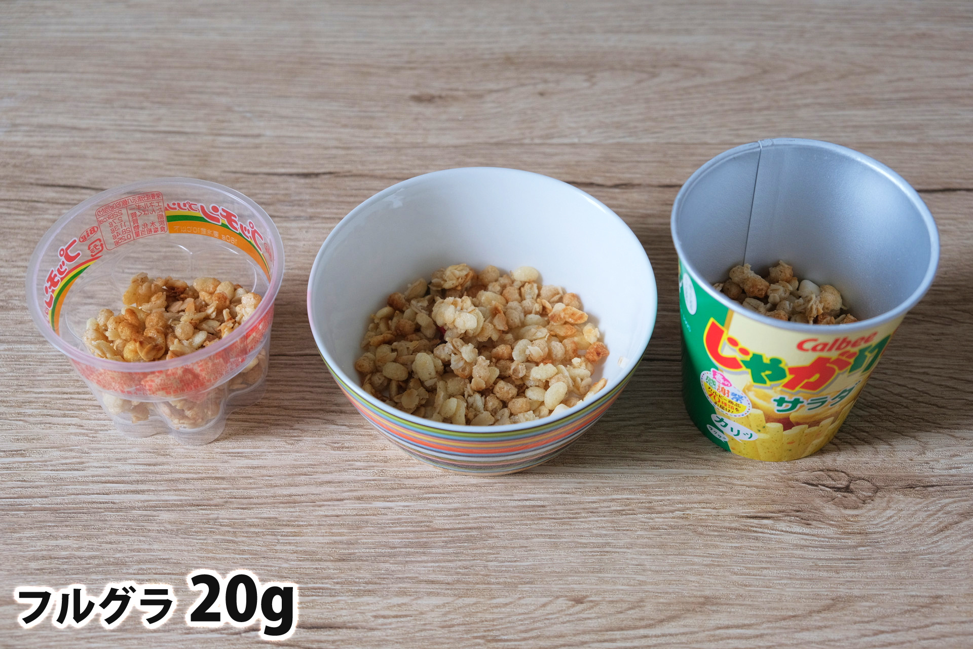 フルグラ20gを「Bigプッチンプリン」「250mlボウル」「じゃがりこカップ」に入れた時の目安