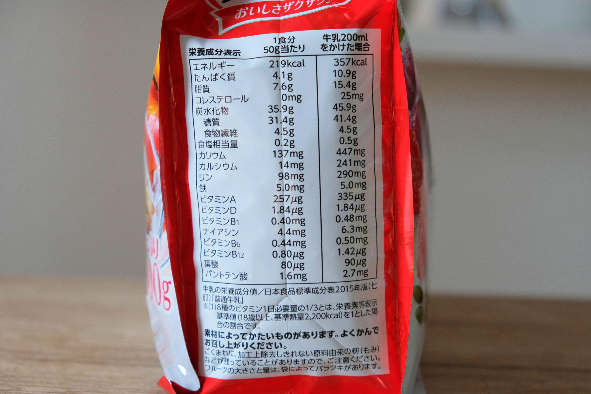 食べ方としては他のシリアルと同様、牛乳・ヨーグルト・豆乳をそれぞれ200gをかけた場合を想定して栄養成分表を作成しました。