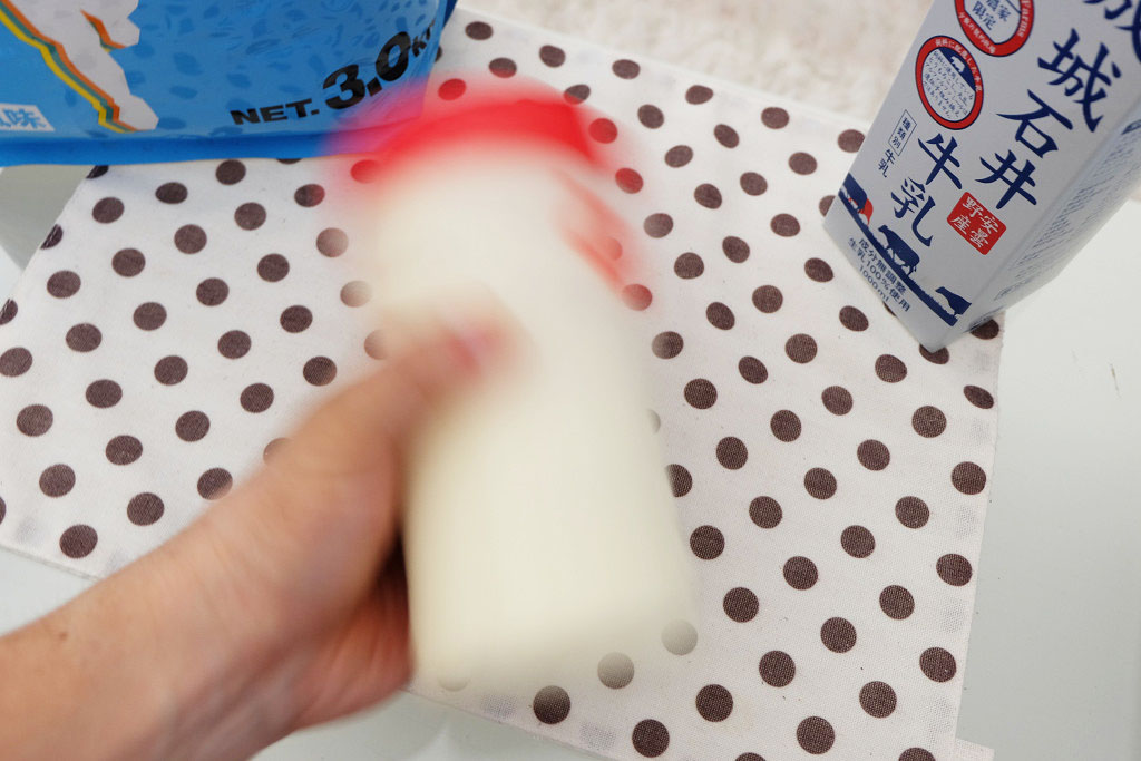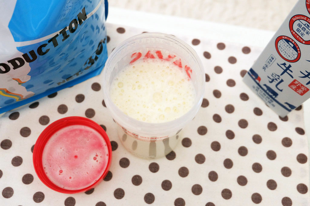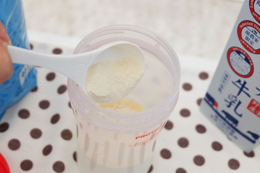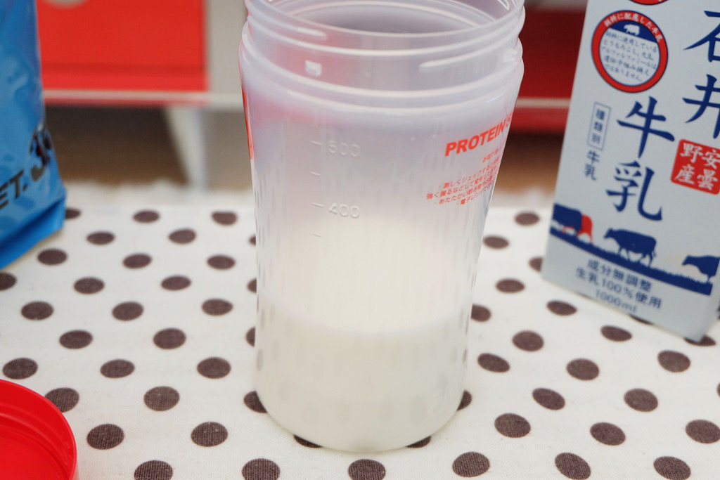 今回はプロテインと混ぜる液体は牛乳にしましたが、水やジュースやスポーツドリンクなどでも大丈夫です。