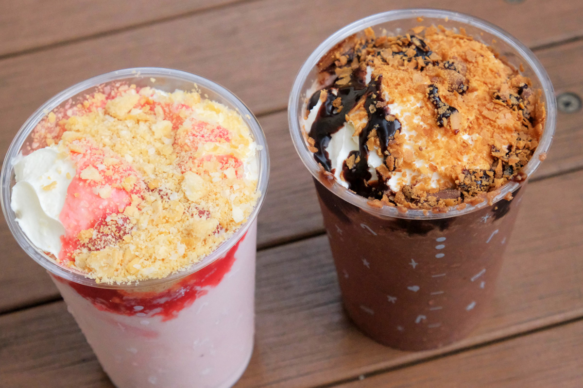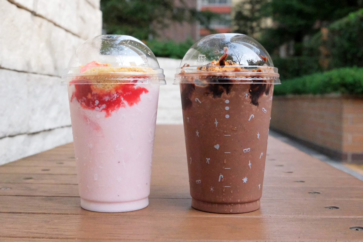 ミルクやチョコなどのシロップとフルーツの果肉やチョコチップなどの具材とともにミキサーで氷を細かく砕いて作られる冷たい飲み物で、上にはクリームやクッキーなどがトッピングされる場合もあります。
