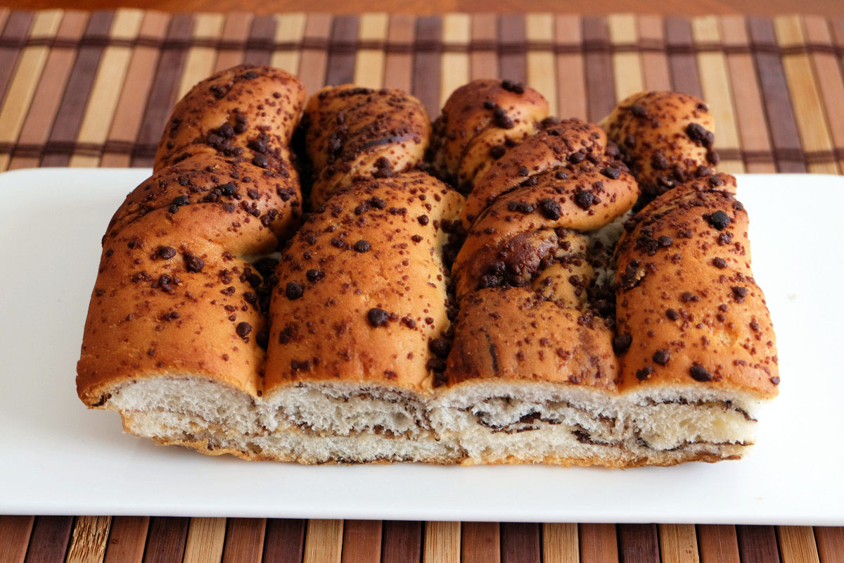 チョコレートが練り込まれたパン生地にチョコのそぼろがトッピングされ、さらにメープルクリームとピーナッツクリームが塗ってあります。