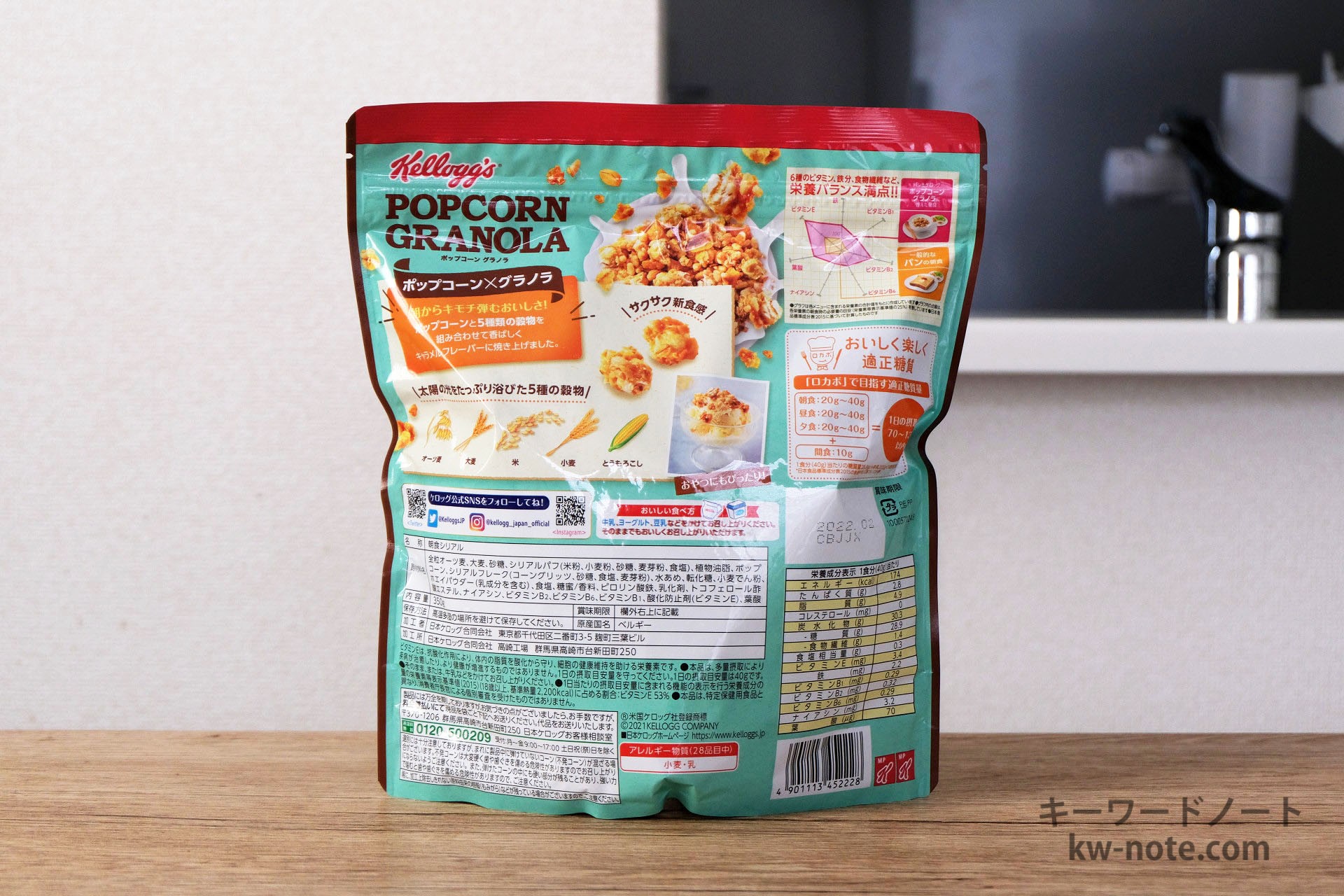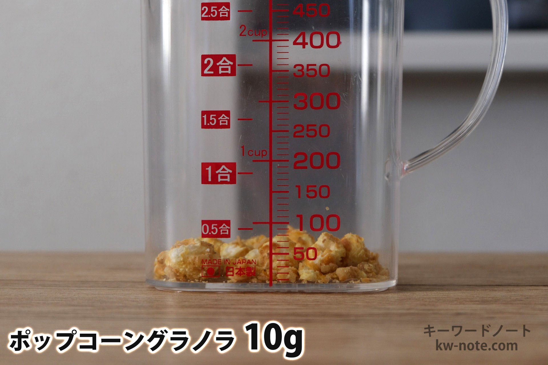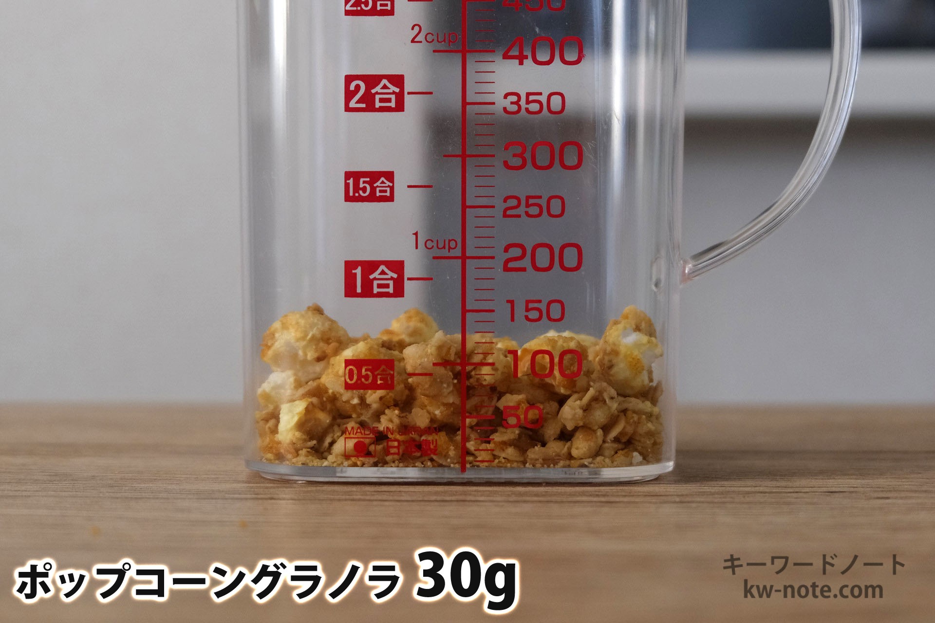 ケロッグから販売されている「ポップコーングラノラ」1食分の量はどれ位なのかと、各グラムごとの分量の目安、牛乳・ヨーグルト・豆乳をかけた時の栄養成分とともにまとめました。