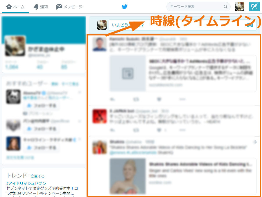 ツイッターで言うと、ログインした直後のフォローしているユーザのつぶやきや自分のつぶやきが時間順に並んでいる画面の事を「タイムライン」と呼びます。