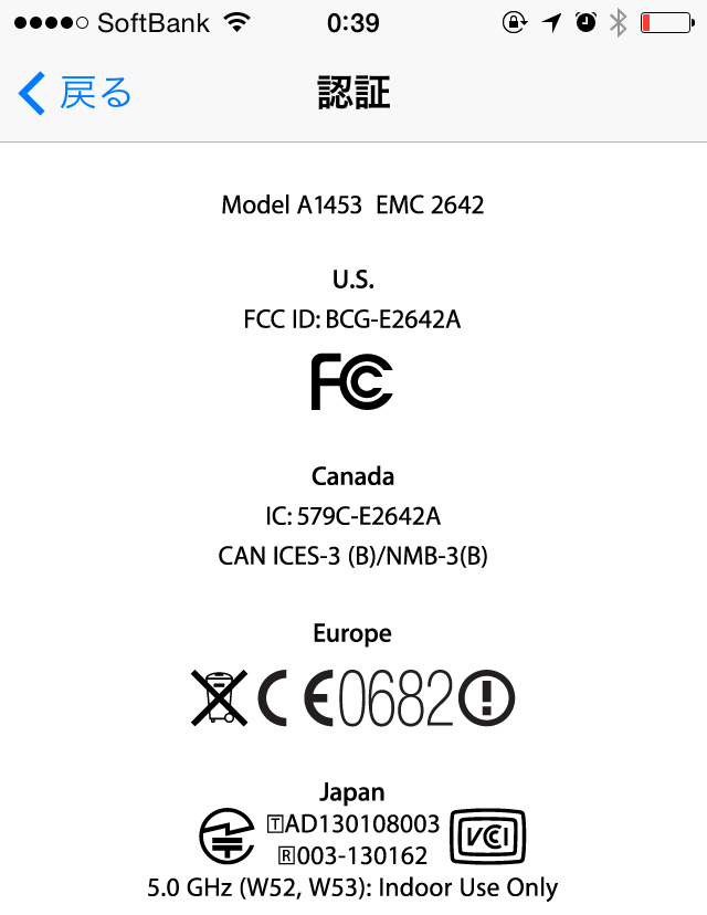 iPhoneだとiOS7の場合、「設定」 → 「一般」 → 「情報」 → 「法律に基づく情報」 → 「認証」から確認する事が出来ます。