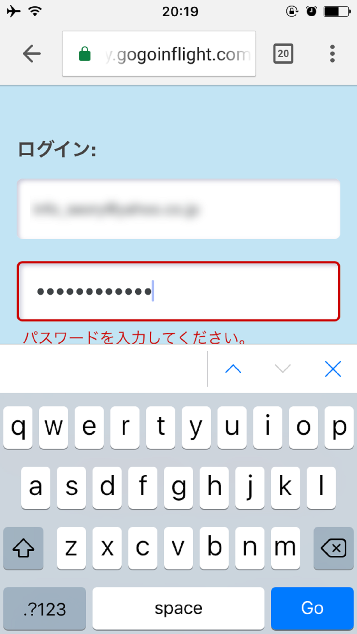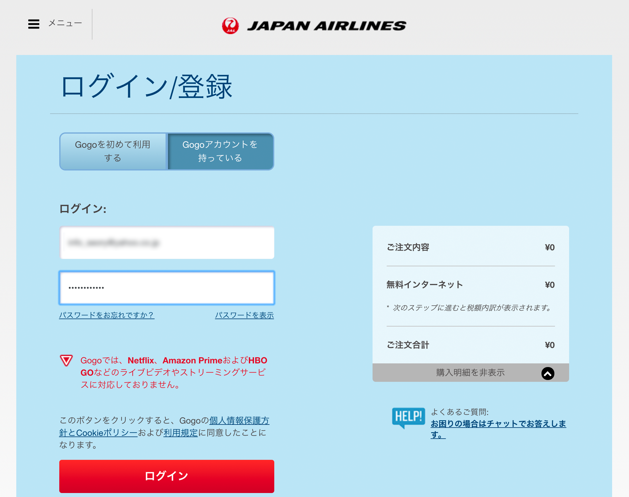 画面が移行したら、あらかじめ登録しておいたGogoのアカウント情報でログインします。