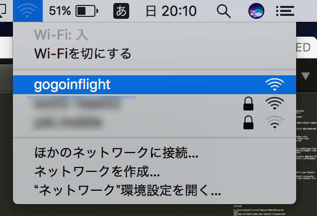 PCの場合はいつもネットに接続するように、Macの場合は右上にあるWi-Fiのマークを、Windowsの場合は右下にある同マークをクリックして「gogoinflight」を選びます。