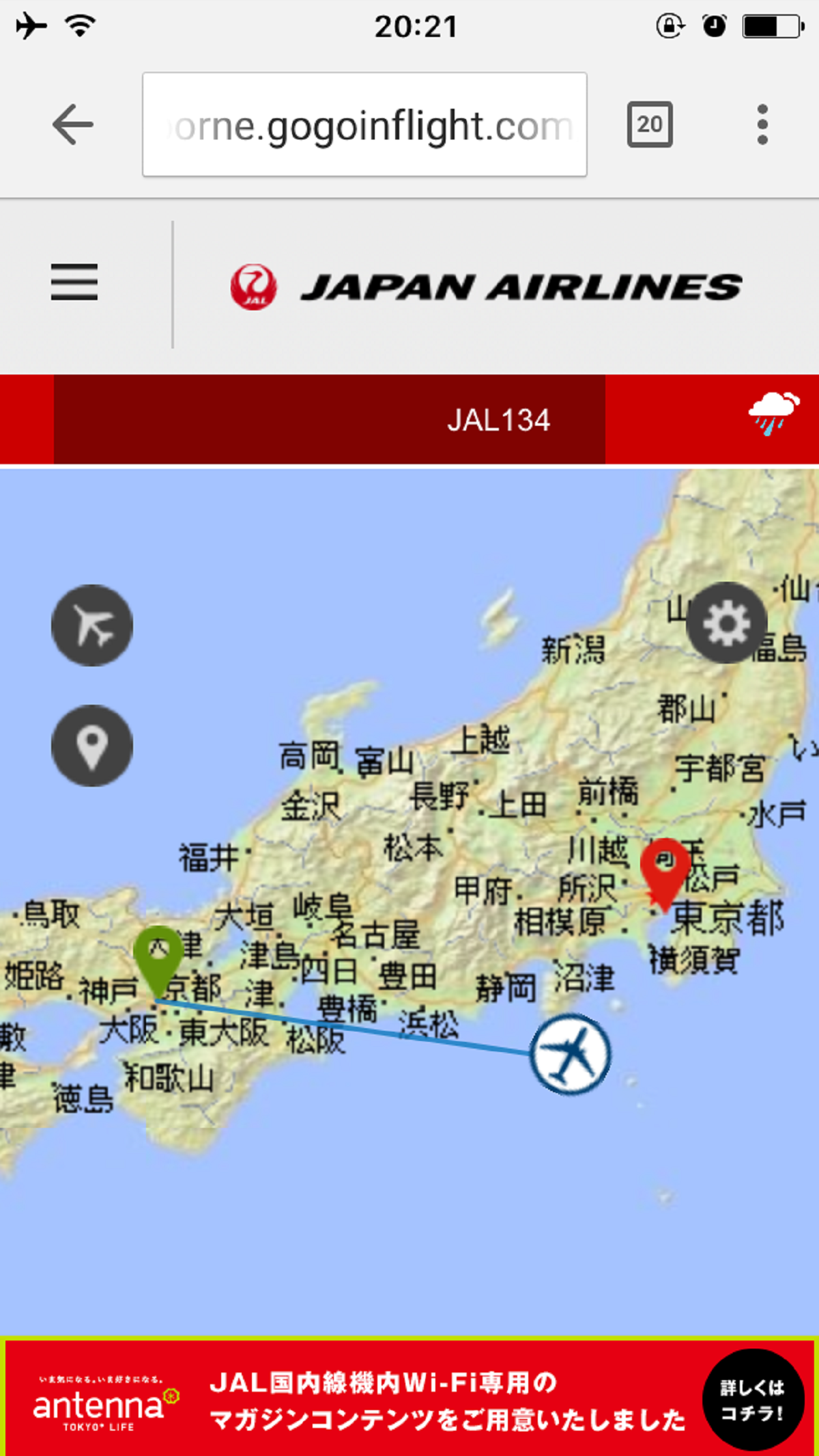 現在どこの上空を飛んでいるのかが地図上に表示されています。