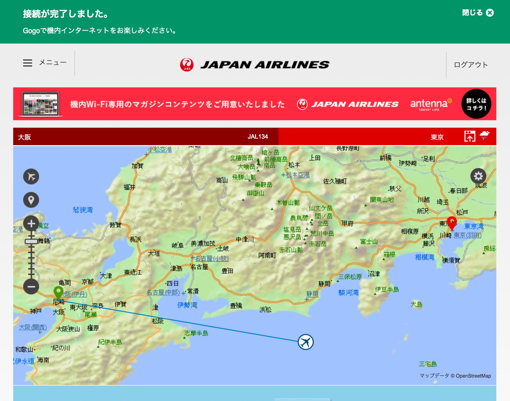 JALの機内で使うWi-Fiは「gogoinflight」という名称になります。