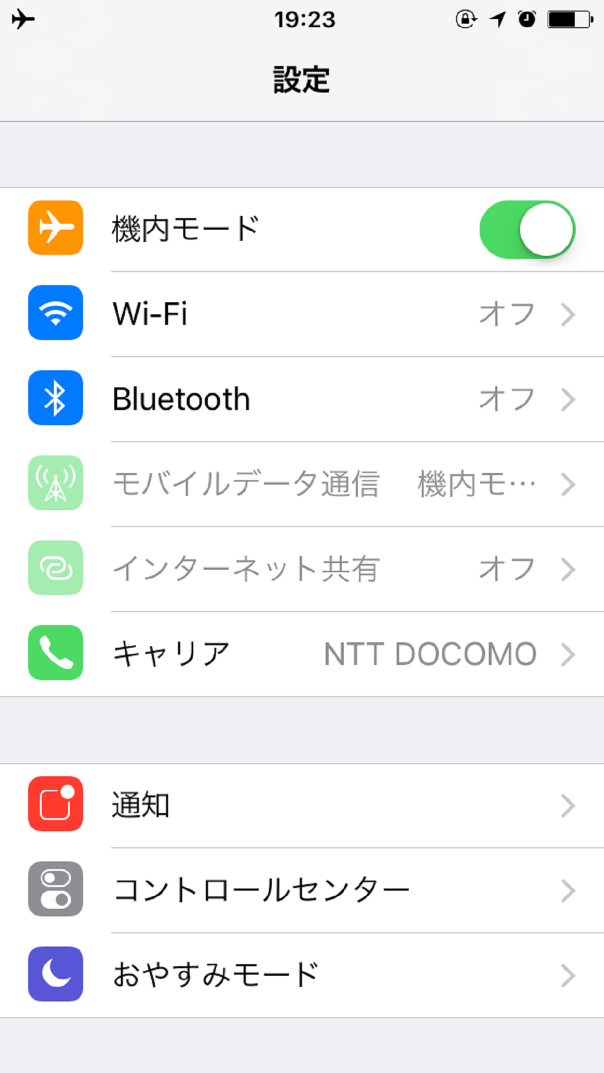 事前(電波を発する機器の使用禁止という機内アナウンス前)に「設定」から「機内モード」をONにしておきます。