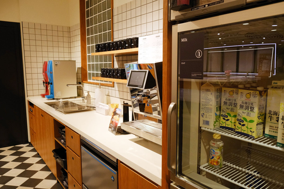 広いキッチンにはエスプレッソマシーンや、ドリップのコーヒー、ミルク、豆乳、ティーバッグや冷たいお茶のドリンクサーバーが。