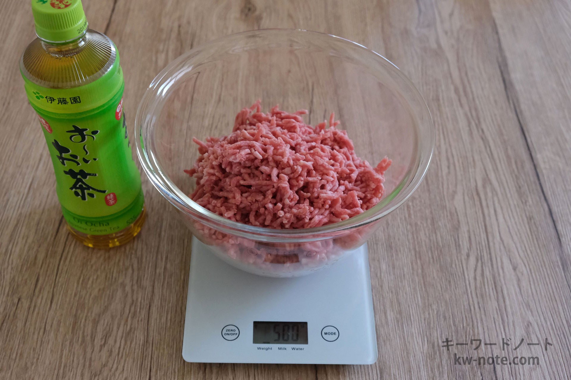 それではひき肉の分量と栄養成分の一覧をご覧下さい(500mlペットボトルは大きさ比較用です)。