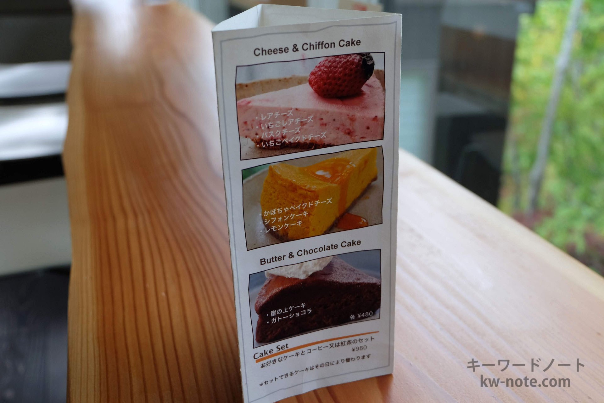 食事はレアチーズケーキやシフォンケーキ、ガトーショコラなどのケーキ各種に、ドリンクはコーヒー各種にお茶とジュースが揃います。