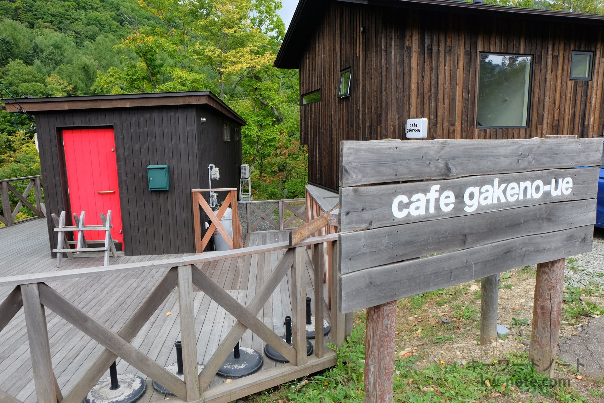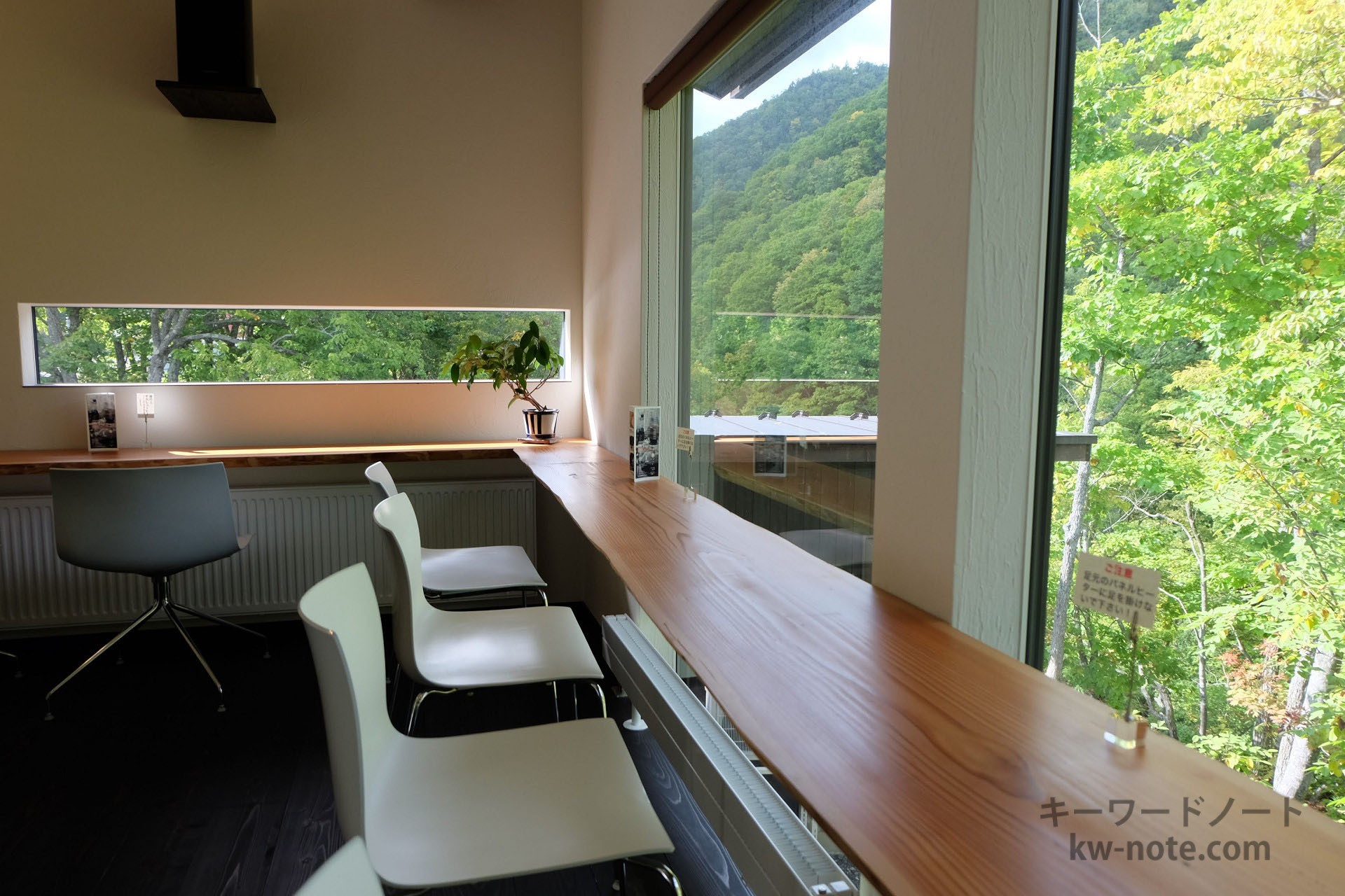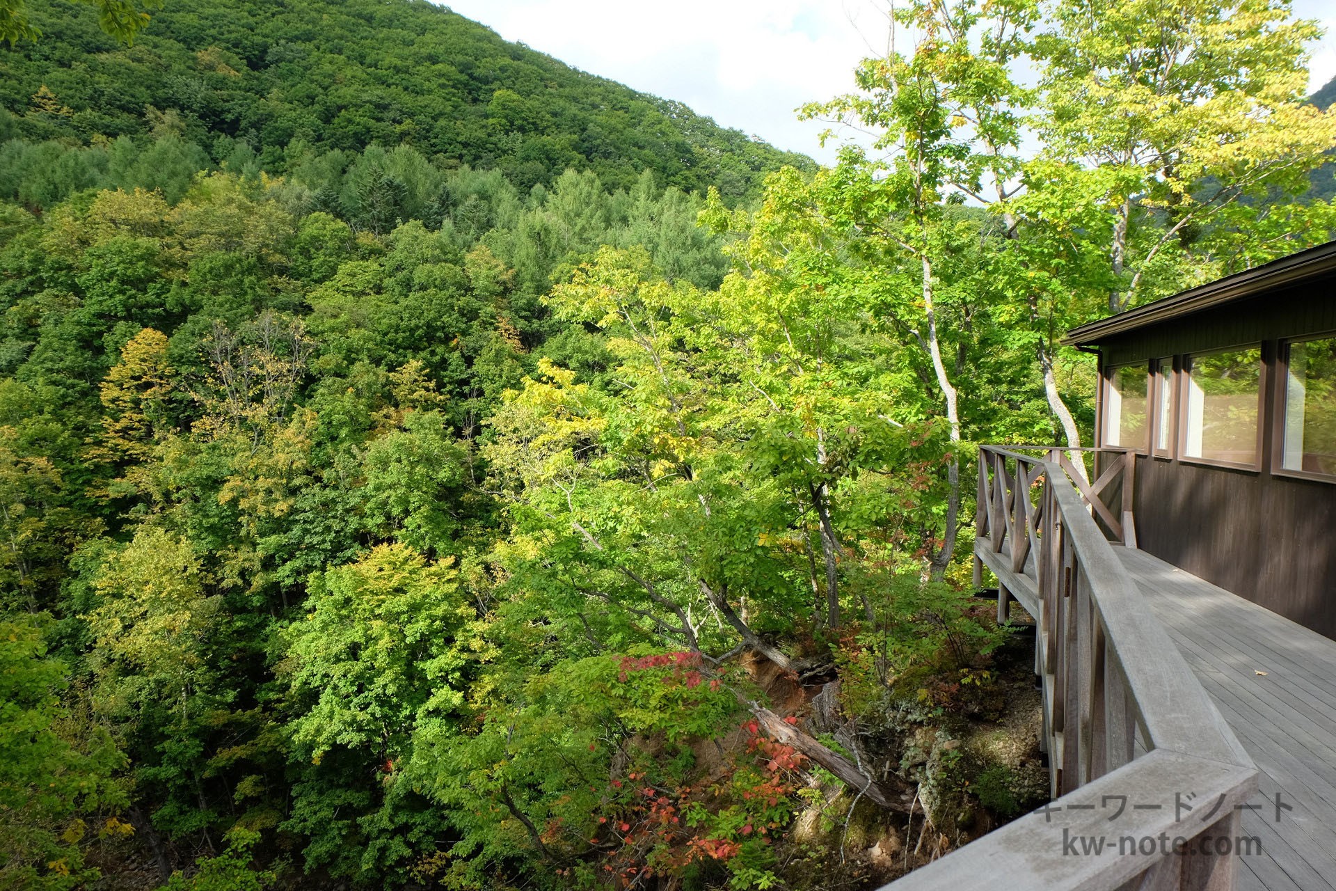 「カフェ 崖の上」は北海道札幌市にある渓谷「定山渓」(じょうざんけい)の崖にそびえ立ち、木々の美しい景色やそこに流れる白井川を一望できるカフェです。