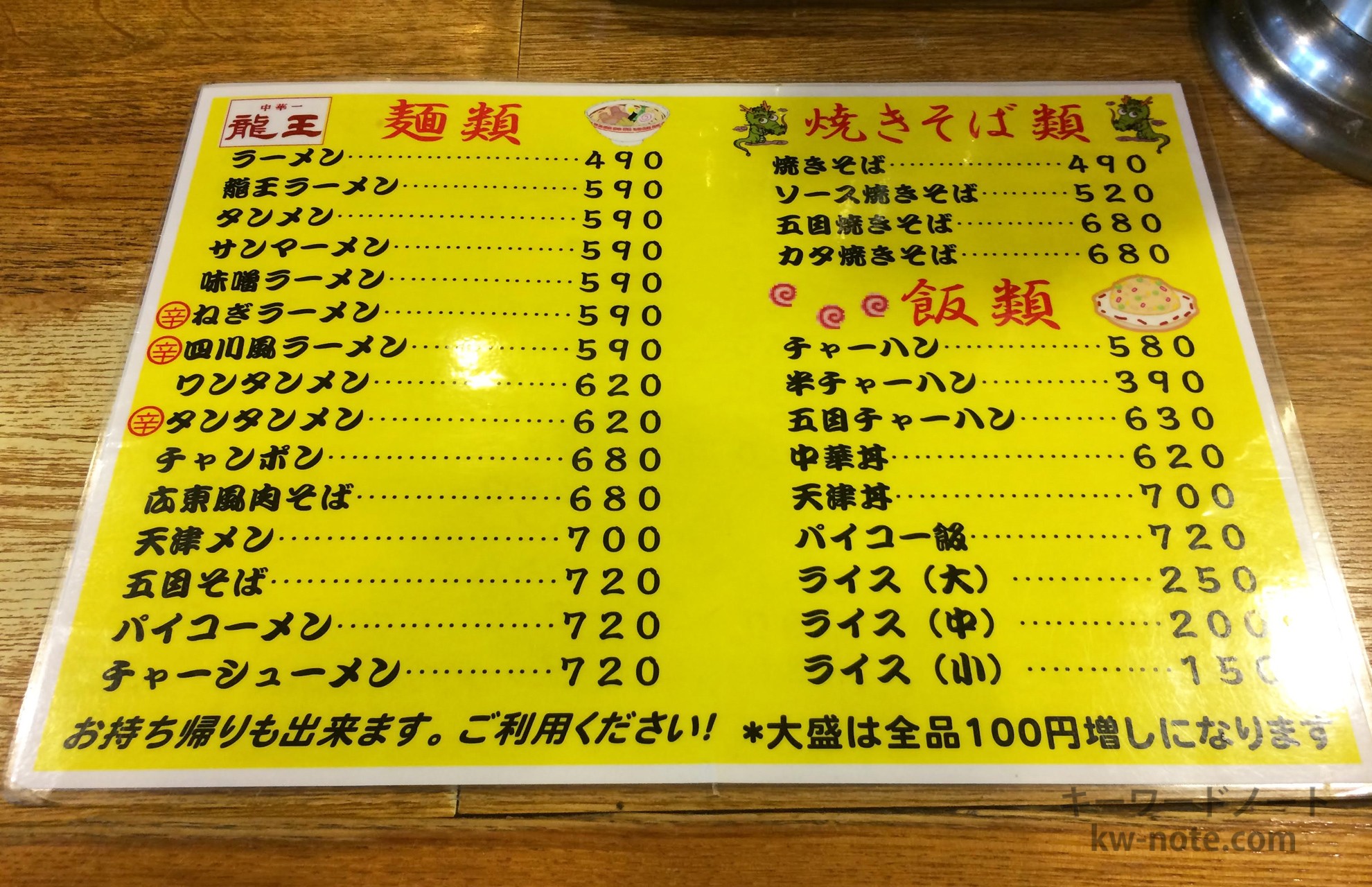 定番は多くの人が注文する餃子に、看板メニューは龍王ラーメン。