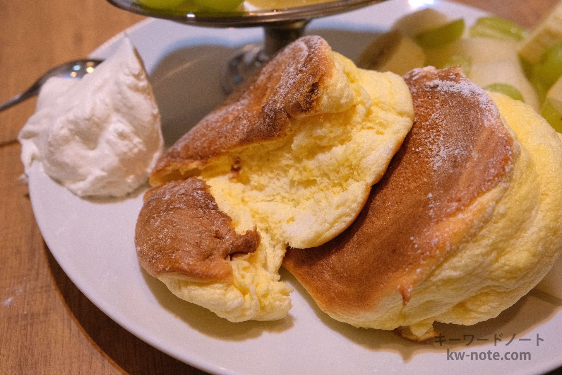パンケーキは甘ったるいのかなと思いきや、トッピングされたクリームも同様かなり砂糖は控えられておりヘルシー、卵の香りがするふわっとした食感でした。