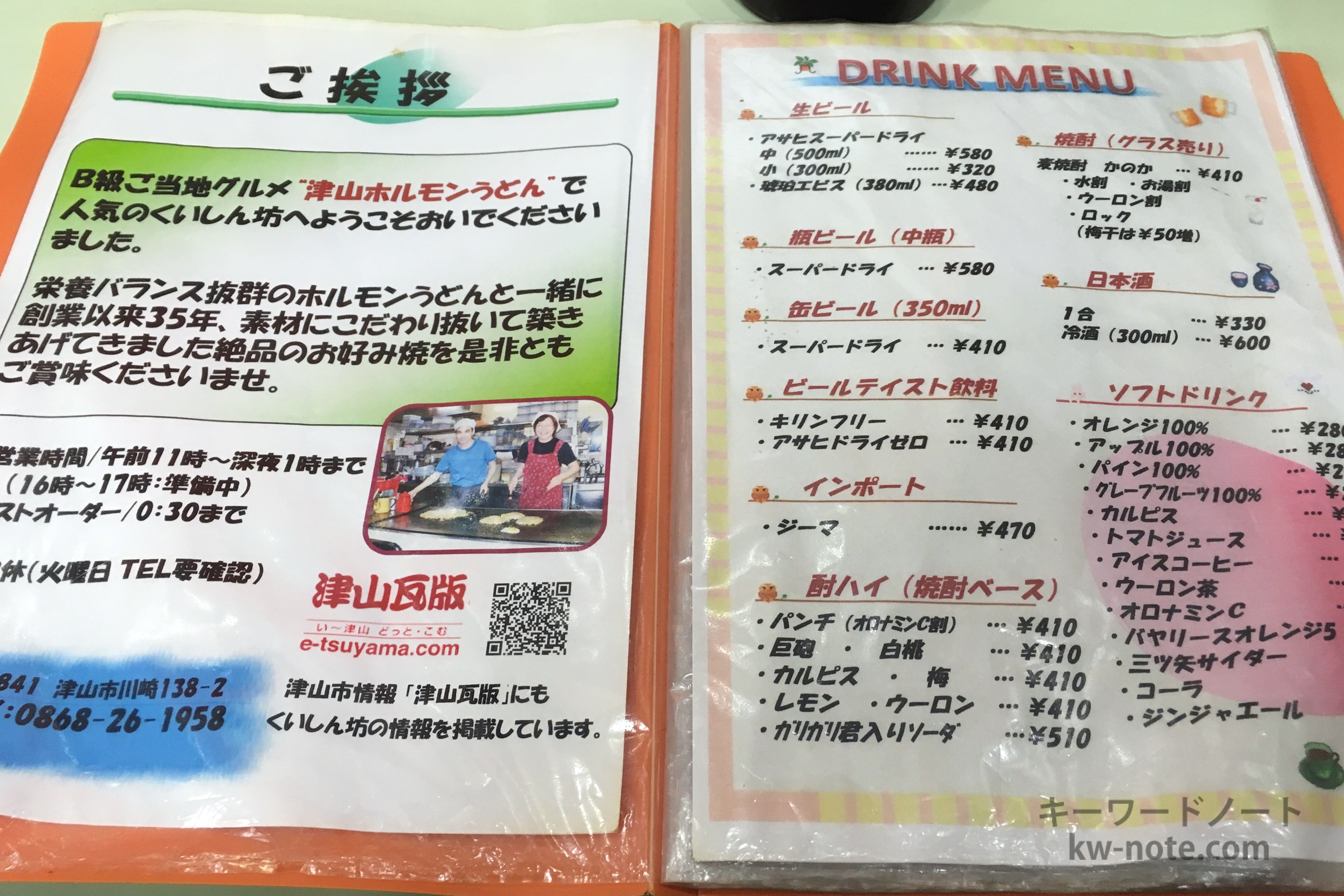 メニューは津山のご当地グルメ・ホルモンうどんの他、お好み焼き、ねぎ焼き、とん平焼きなど、粉ものの鉄板焼きが揃っています。