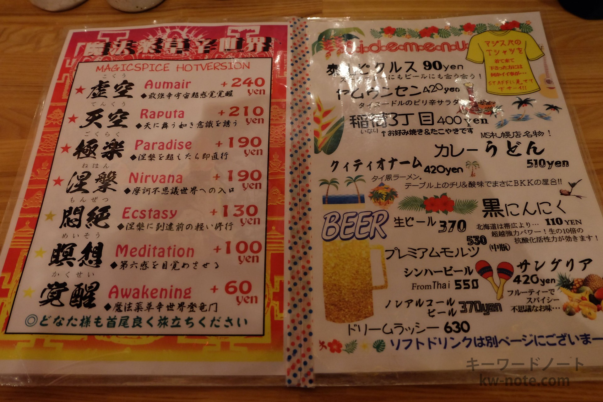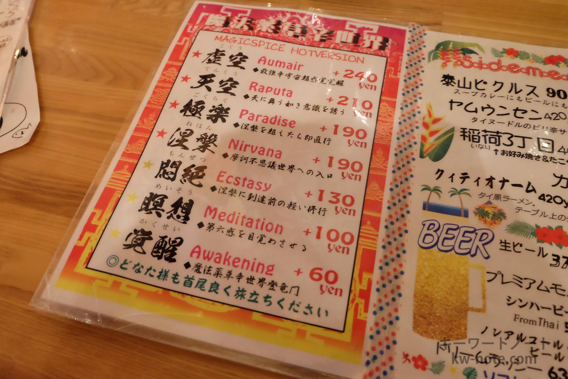 辛さの段階は「覚醒(かくせい)」「瞑想(めいそう)」「悶絶(もんぜつ)」「涅槃(ねはん)」「極楽(ごくらく)」「天空(てんくう)」「虚空(こくう)」です。