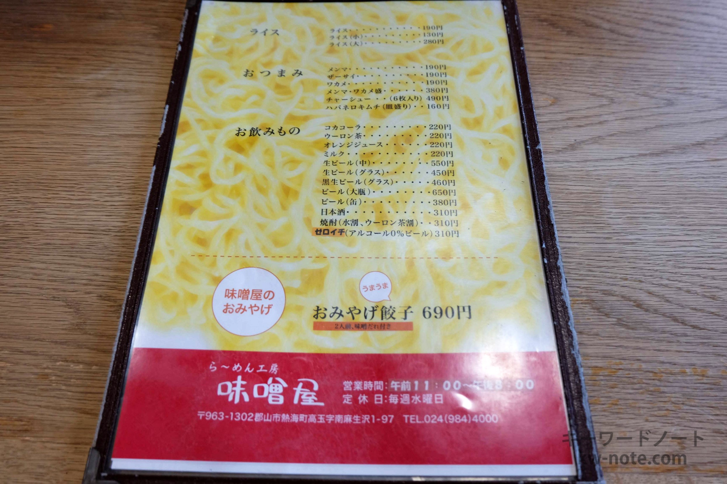 ここ郡山の味噌屋本店だけでなく、「らーめん工房 味噌屋 岩沼分店」として宮城県にも店舗があります(2022年時点)。