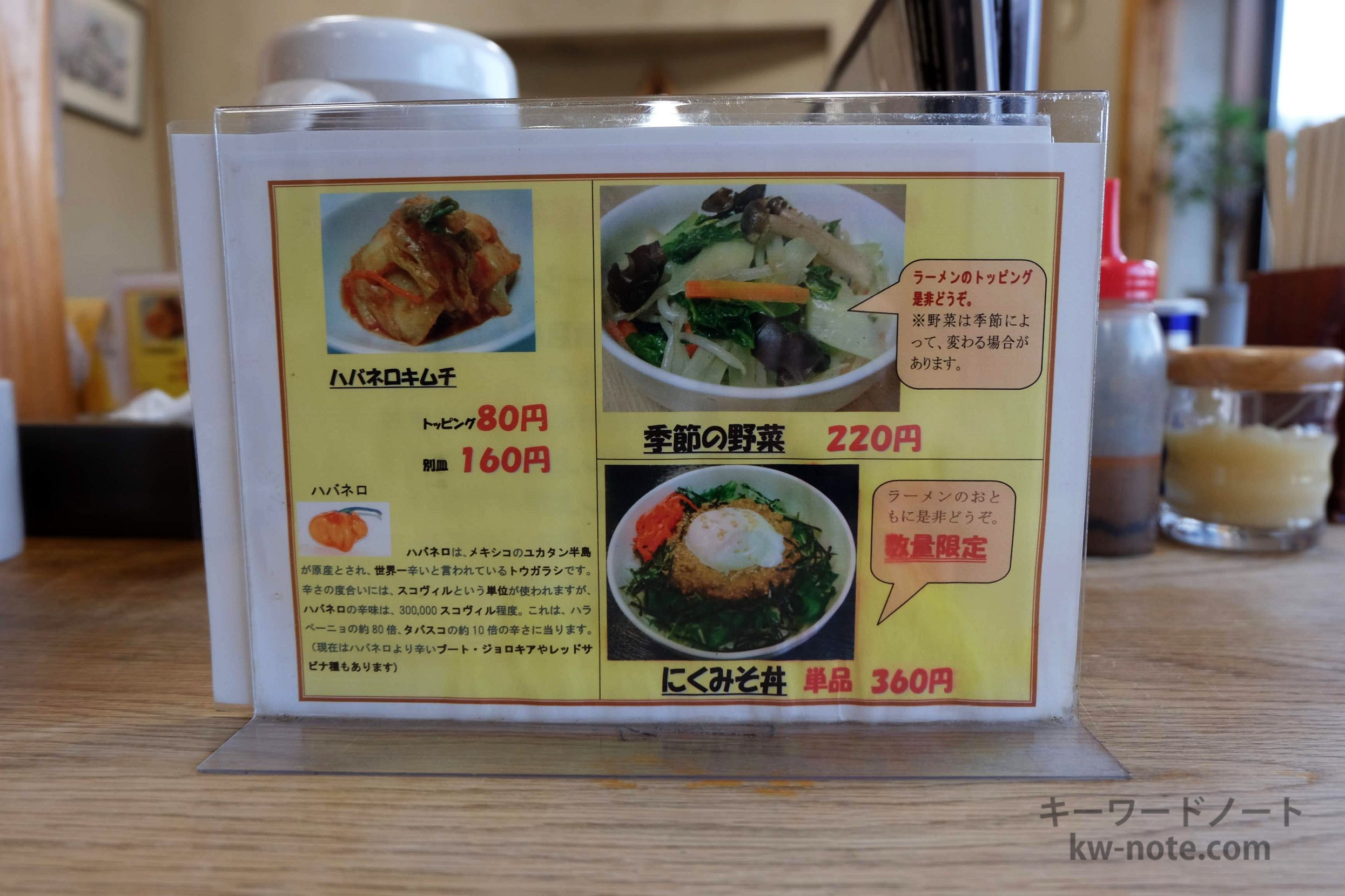 地元の郡山で契約して作られているオリジナルの地味噌を使い、基本ほぼすべてのラーメンは味噌をベースとしたラインナップとなっています(醤油味の中華そばもあります)。
