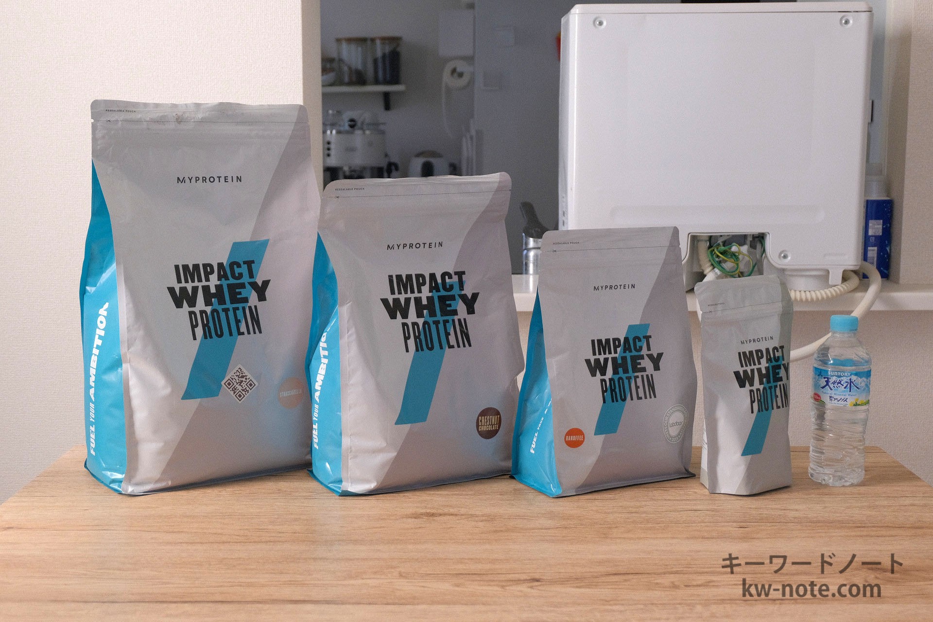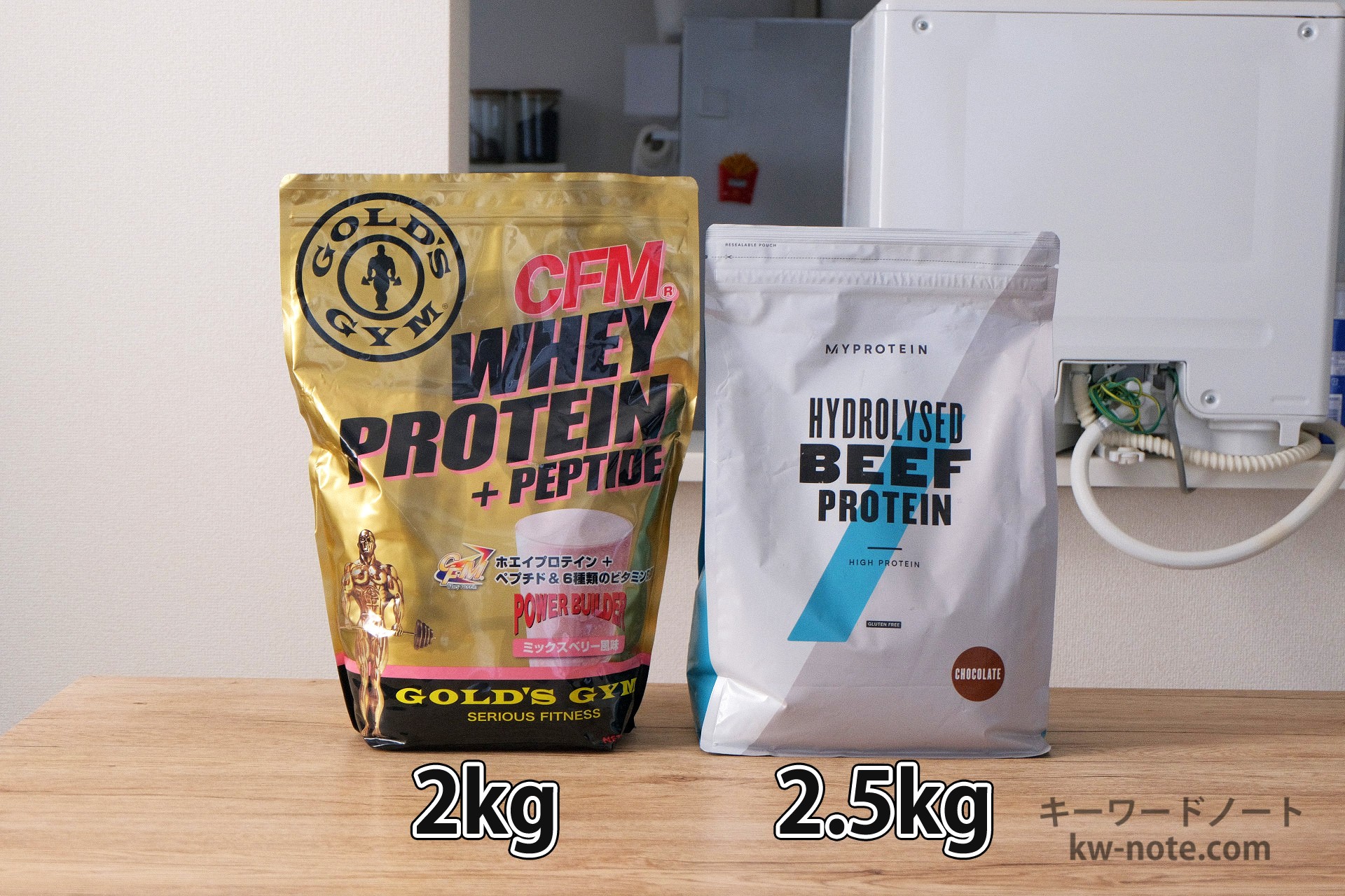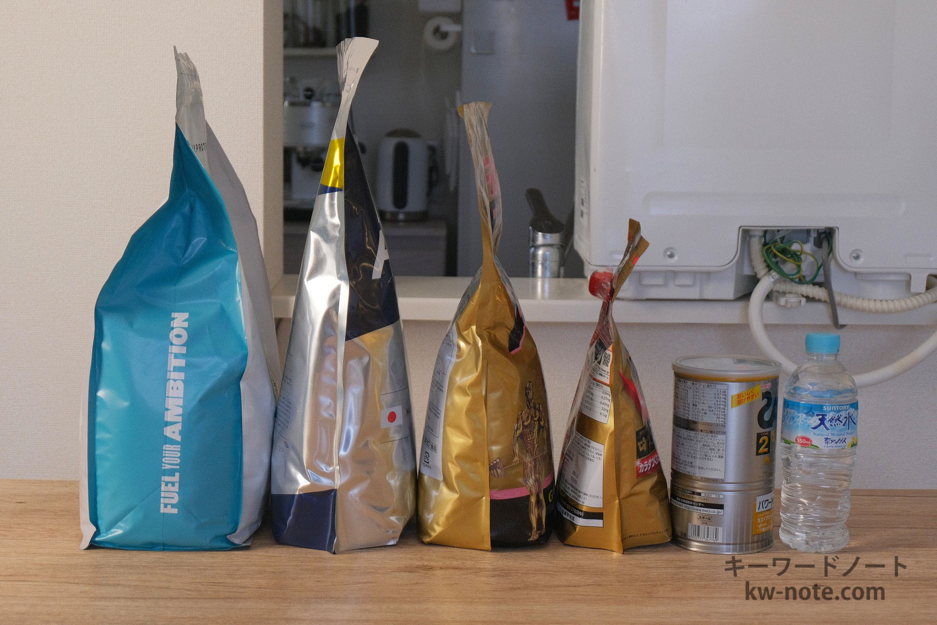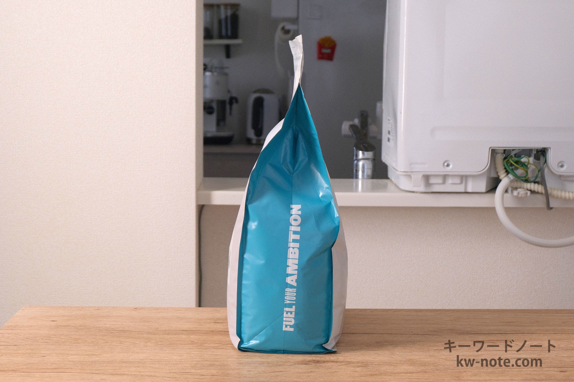 なおホエイとソイなどプロテインの種類によってやや比重が違いますが、大きくは変わらないため袋の大きさもそれほどの違いは無いものと考えて問題ないかと思います。