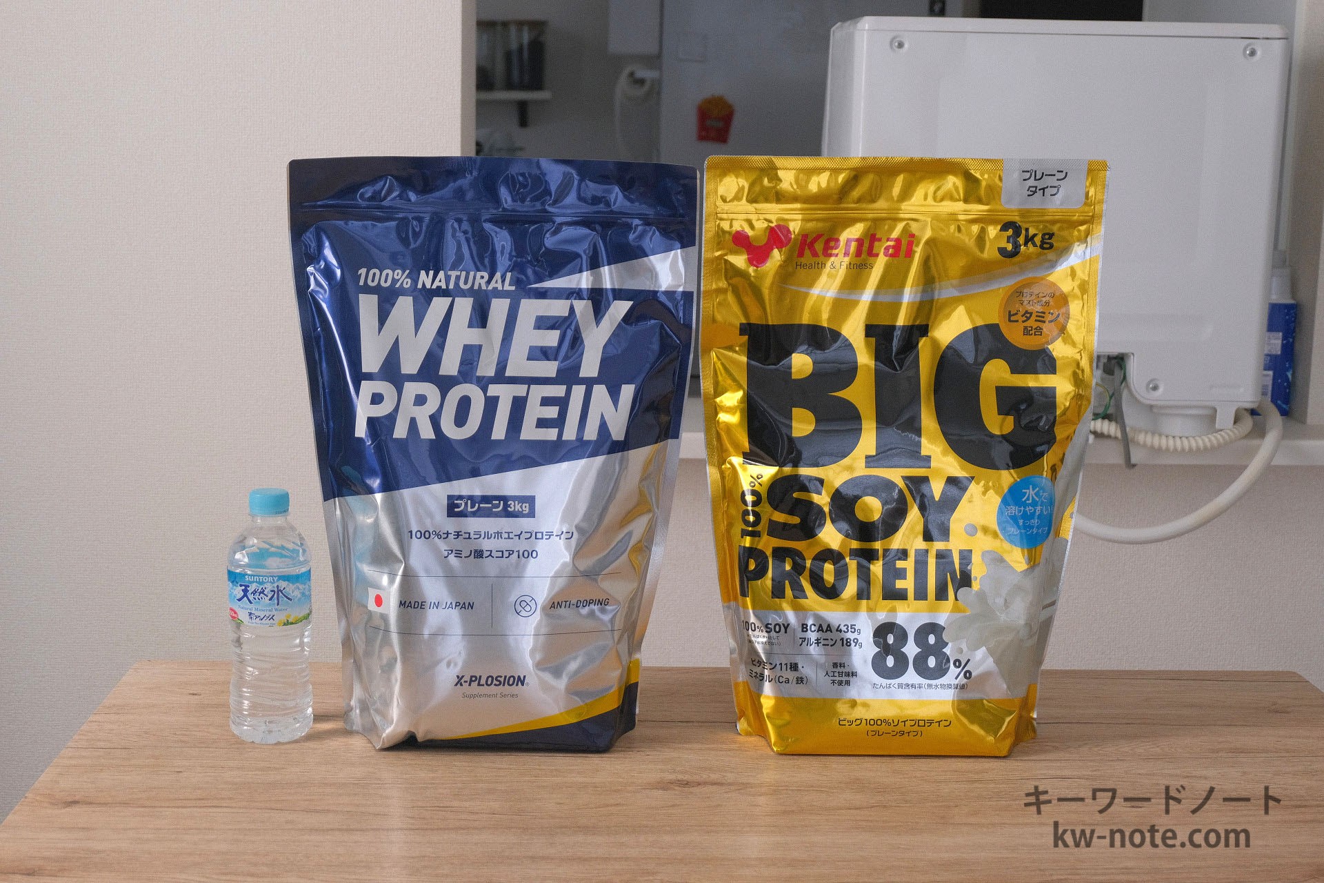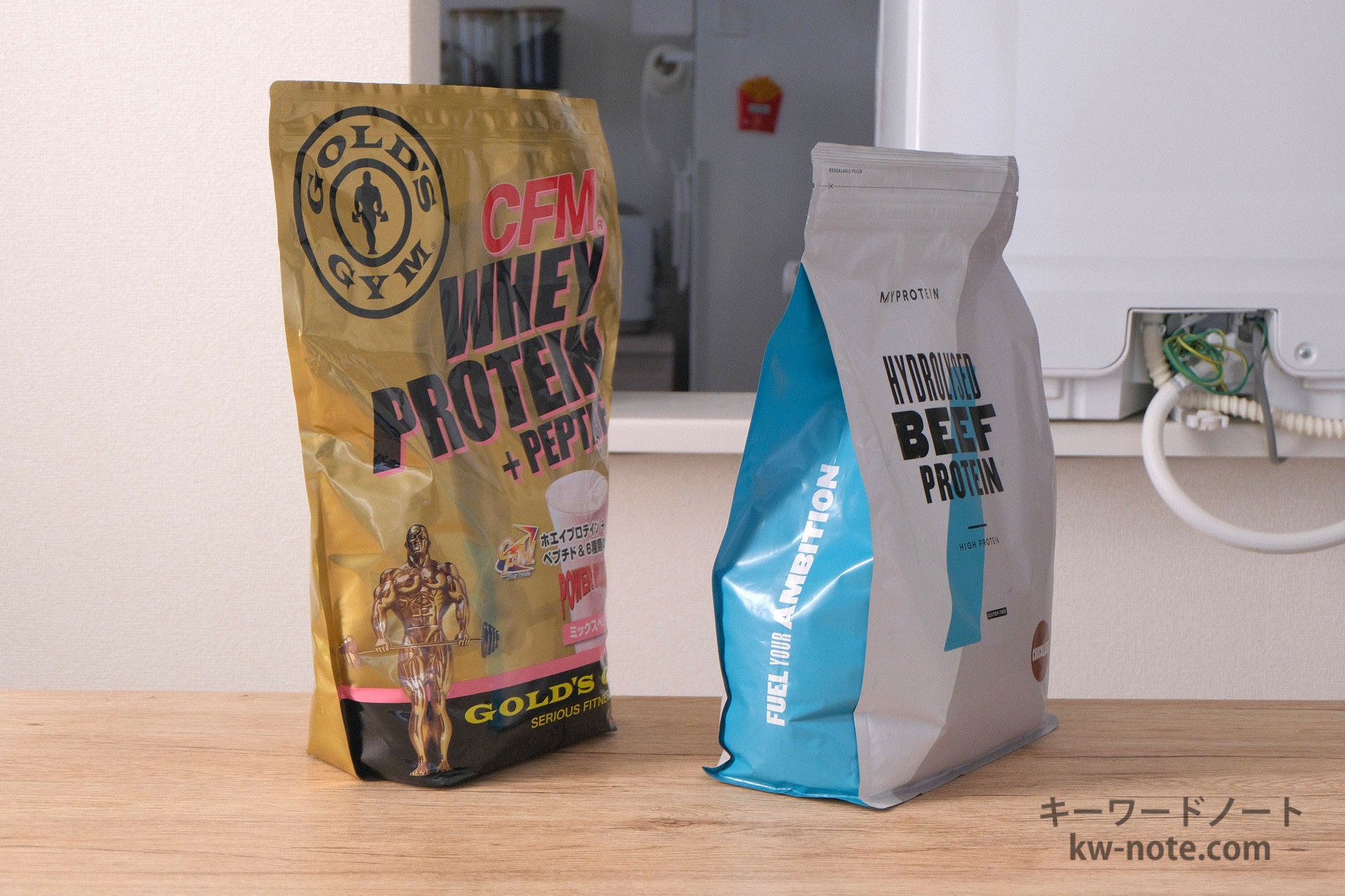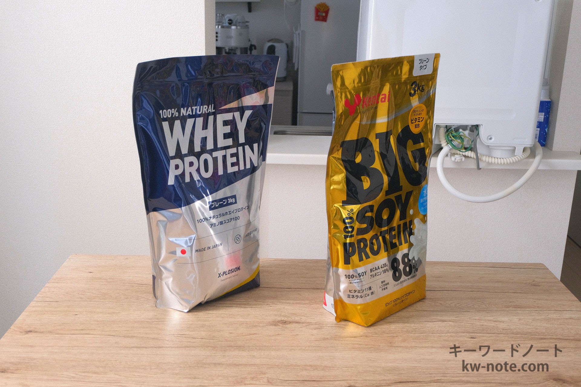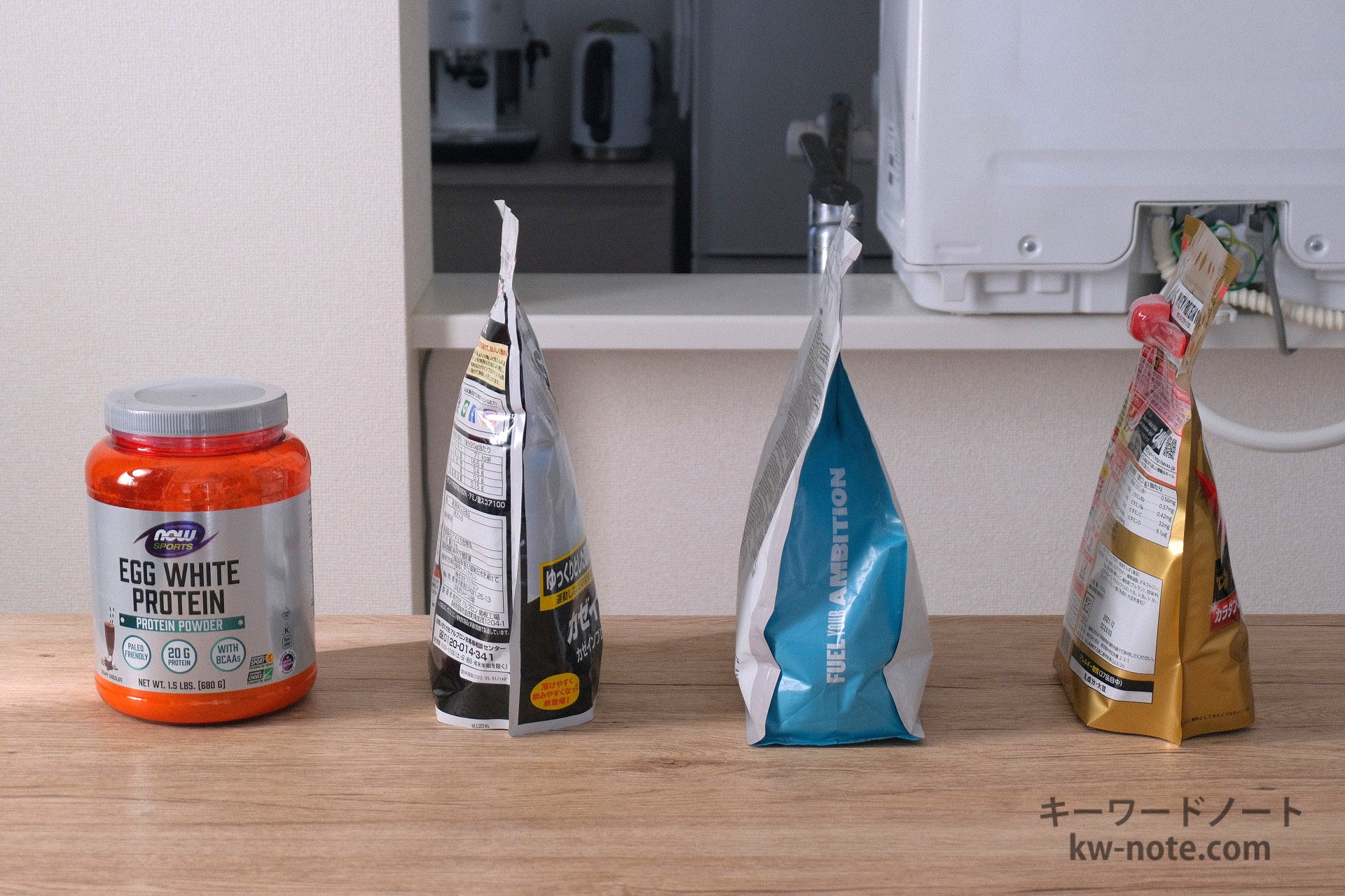なおホエイとソイなどプロテインの種類によってやや比重が違いますが、大きくは変わらないため袋の大きさもそれほどの違いは無いものと考えて問題ないかと思います。