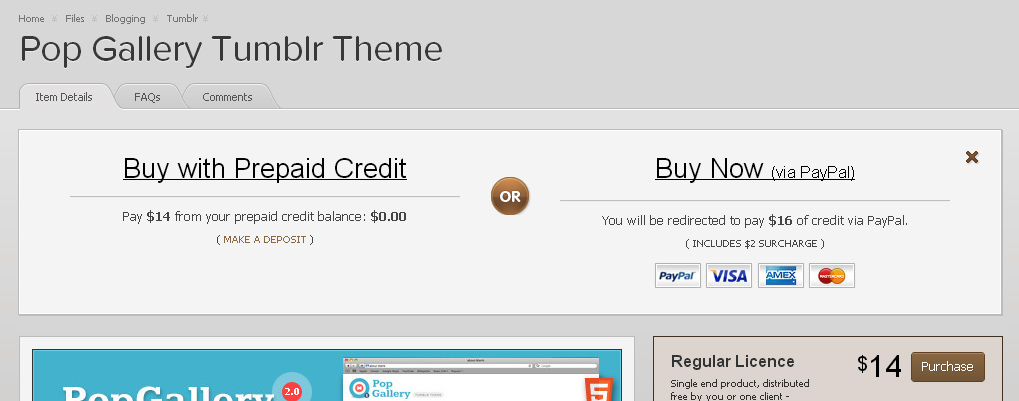 ThemeForestのアカウントに(テーマの販売価格より多い金額を)入金し、その残金の中からテーマを購入します。