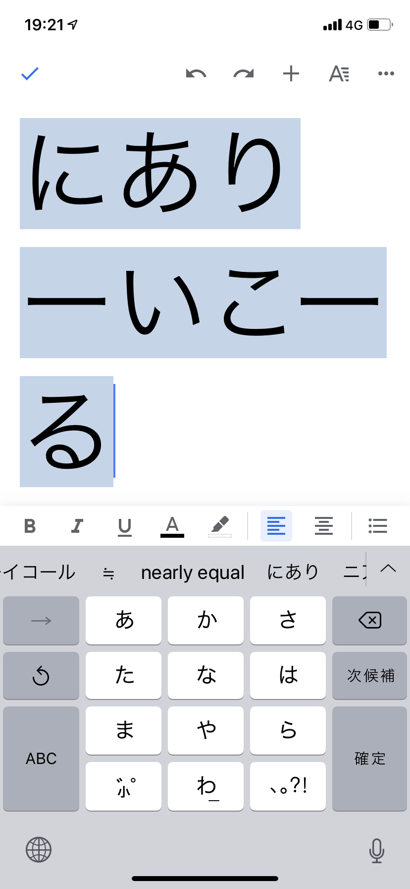 - 「にありーいこーる」とひらがなで打って変換